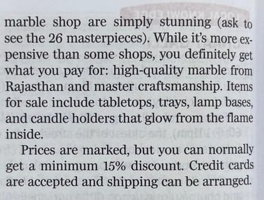 Subhash Emporium has been featured with a STAR listing in the highly trusted travel guide, Lonely Planet, in every edition since 2009, as the only authentic marble inlay museum and boutique to experience Parchin Kari art.