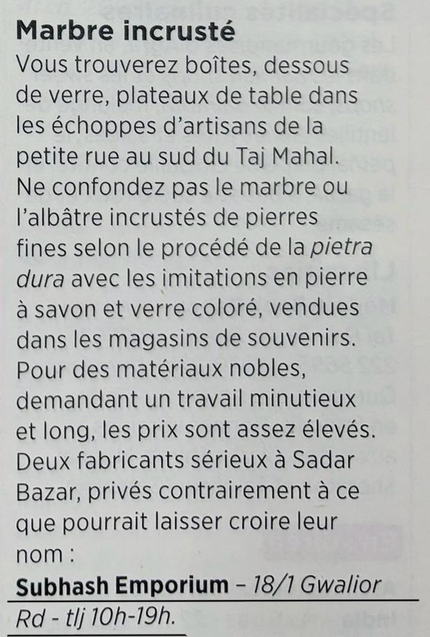 Michelin Le Guide Vert; Rajasthan: Delhi, Agra, Pg no. 95, mentions about Subhash Emporium as a serious manufacturer that uses noble materials in the art of marble inlay. Contrary to what it's name suggest, Subhash Emporium is a privately owned gallery.