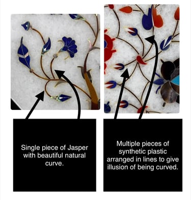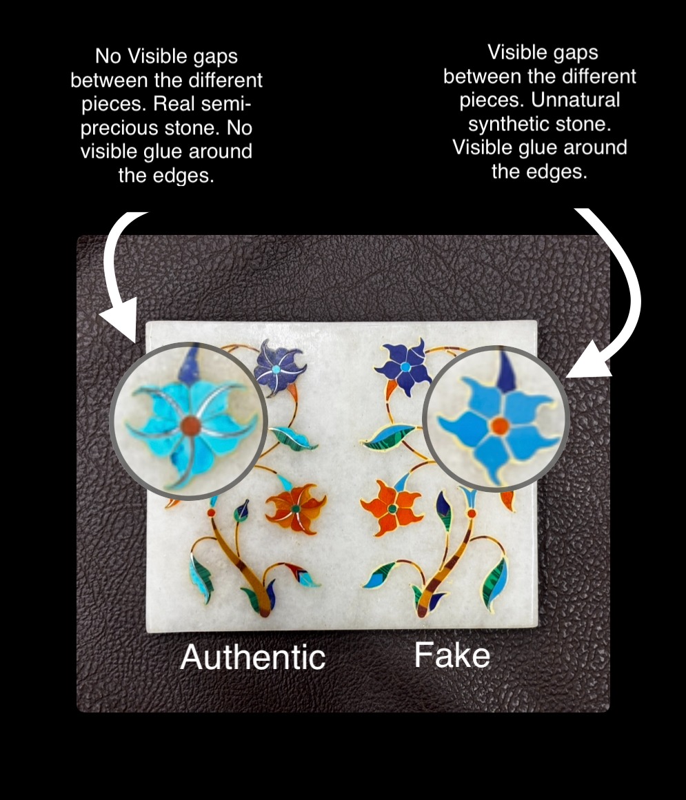 A very easy way to identify fake or synthetic stones in marble inlay art is by poking them with a needle. If the stone gets pierced easily or with slightest of pressure, then the stone is fake or synthetic. The needle will always tend to slip on a real hard semi-precious stone indicating its authenticity.